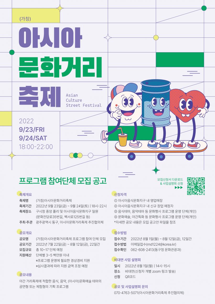 [°ø°£´º½º = ±è´ë¿µ±âÀÚ] ±¤ÁÖ µ¿±¸(±¸Ã»Àå ÀÓÅÃ)´Â ¿À´Â 9¿ù 23~24ÀÏ ¾Æ½Ã¾ÆÀ½½Ä¹®ÈÁö±¸¿¡¼ ¿¸± ¡®¾Æ½Ã¾Æ ¹®È°Å¸® ÃàÁ¦¡®¿¡ Âü¿©ÇÒ °³ÀΡ¤´Üü¸¦ ¸ðÁýÇÑ´Ù°í ¹àÇû´Ù.