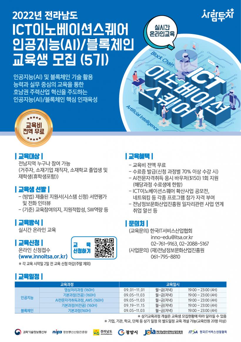±³À°ºñ´Â Àü¾× ¹«·áÀ̰í ÀΰøÁö´É(AI)°ú ºí·ÏüÀο¡ °ü½ÉÀÌ ÀÖ´Â Àü³²µµ¹ÎÀÌ¸é ´©±¸³ª Àü³²ICTÀ̳뺣À̼ǽºÄù¾î ´©¸®Áý(www.innoitsa.or.kr)À» ÅëÇØ ½ÅûÇÒ ¼ö ÀÖÀ¸¸ç, ¼ö·áÀÚ´Â Ãë¾÷ ¿¬°è¸¦ Áö¿øÇÑ´Ù.