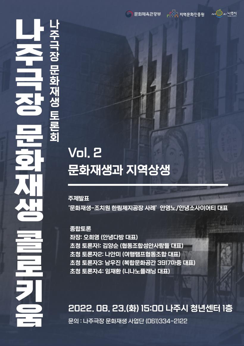 ³ªÁÖ½Ã(½ÃÀå À±º´ÅÂ)´Â 23ÀÏ ¿ÀÈÄ 3½ÃºÎÅÍ ³ªÁֽà û³â¼¾ÅÍ(Åä°è±æ 61)¿¡¼ ¡®³ªÁÖ±ØÀå ¹®ÈÀç»ý ÄÝ·ÎŰ¿ò : Vol.2 ¹®ÈÀç»ý°ú Áö¿ª»ó»ý¡¯À» ÁÖÁ¦·Î ½Ã¹Î, Àü¹®°ú, »ç¾÷°ü°èÀÚ µîÀÌ Âü¿©ÇÏ´Â Æ÷·³À» °³ÃÖÇÑ´Ù°í 23ÀÏ ¹àÇû´Ù.