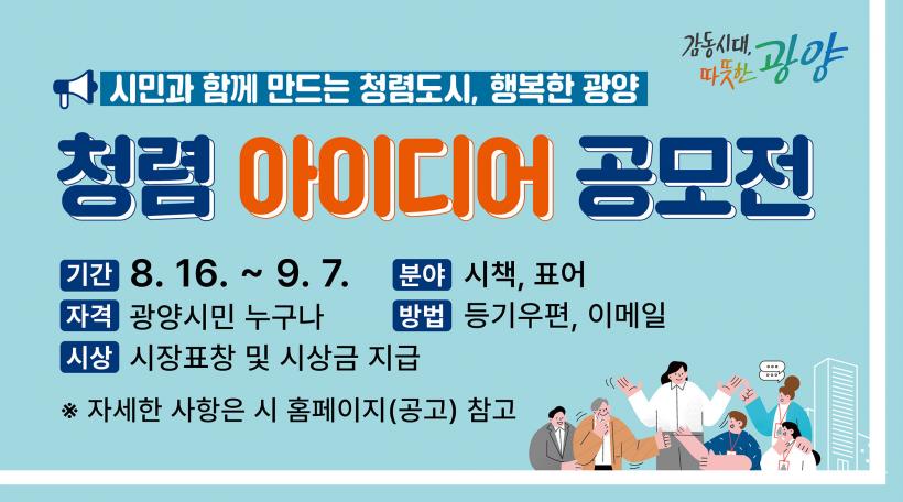 [°ø°£´º½º = ±è´ë¿µ±âÀÚ] ±¤¾ç½Ã´Â û·Å¿¡ ´ëÇÑ °ü½É°ú Âü¿©¸¦ ³ôÀ̰í ÇÔ²² ¸¸µå´Â û·ÅÇÑ °øÁ÷¹®È Á¶¼ºÀ» À§ÇØ ½Ã¹ÎÀ» ´ë»óÀ¸·Î ¿À´Â 9¿ù 7ÀϱîÁö ¡®Ã»·Å ¾ÆÀ̵ð¾î °ø¸ðÀü¡¯À» °³ÃÖÇÑ´Ù.