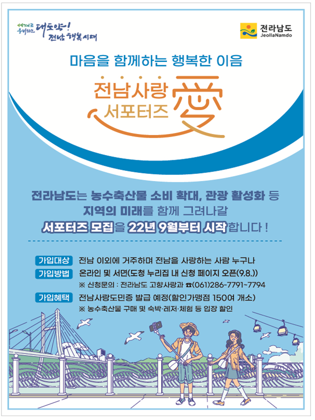 ¼Æ÷ÅÍÁî °¡ÀÔÀº 9¿ù 8ÀÏ °³½ÃÇÏ´Â Àü³²µµÃ» ´©¸®Áý(https://www.jeonnam.go.kr/)ÀÇ ¼Æ÷ÅÍÁî ½ÅûÅÇÀ» ÅëÇÑ ¿Â¶óÀÎ ¹æ½Ä°ú ½Åû¼ ÀÛ¼ºÀ» ÅëÇÑ ¼¸é ¹æ½ÄÀ¸·Î ¼Õ½±°Ô ½ÅûÇÒ ¼ö ÀÖ´Ù.