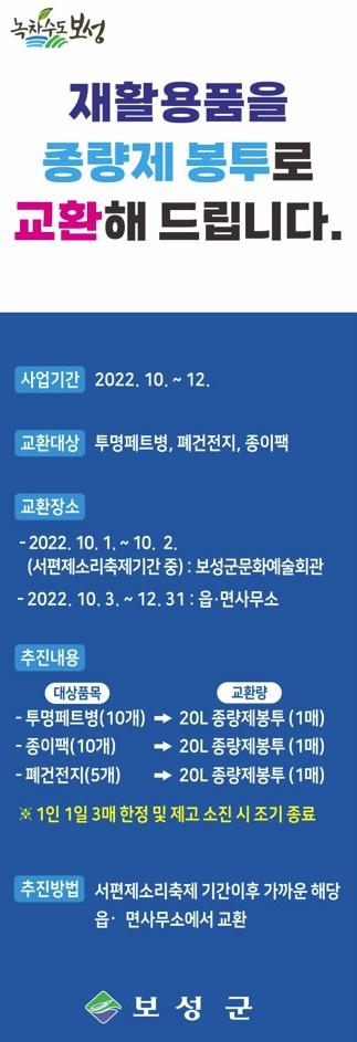 [°ø°£´º½º = ±è´ë¿µ±âÀÚ] º¸¼º±ºÀÌ ÀçȰ¿ëǰ ÀÎ½Ä °³¼±À» À§ÇØ 10¿ùºÎÅÍ 12¿ù±îÁö ÀçȰ¿ëǰÀ» ¡®Á¾·®Á¦ ºÀÅõ(20L) ¡¯·Î ¹Ù²ãÁÖ´Â ±³È¯Çà»ç¸¦ ÁøÇàÇÑ´Ù.