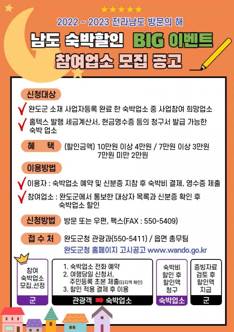 [°ø°£´º½º = Çѵ¿¼ø±âÀÚ] ¿Ïµµ±º(±º¼ö ½Å¿ìö)¿¡¼´Â ¡®2022~2023 Àü¶ó³²µµ ¹æ¹®ÀÇ ÇØ¡¯¸¦ ¸Â¾Æ ¡®³²µµ ¼÷¹Ú ÇÒÀÎ ºò À̺¥Æ® Áö¿ø »ç¾÷¡¯¿¡ Âü¿©ÇÒ ¼÷¹Ú¾÷¼Ò¸¦ 10¿ù 14ÀϱîÁö ¸ðÁýÇÑ´Ù.