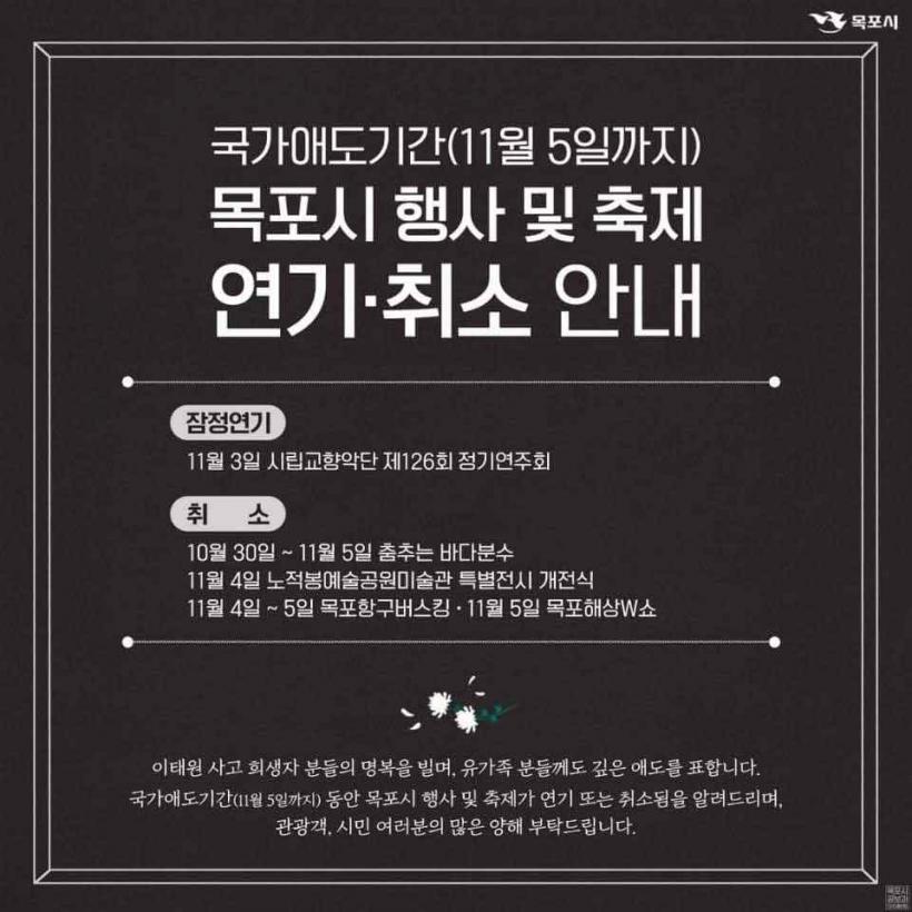 [°ø°£´º½º = ±è¿ëÁø±âÀÚ] ¸ñÆ÷½Ã°¡ Áö³ 10¿ù 29ÀÏ ¹ß»ýÇÑ ÀÌÅ¿ø Âü»ç Èñ»ýÀÚ¸¦ ¾ÖµµÇϱâ À§ÇØ °³ÃÖ ¿¹Á¤À̾ú´ø ¹®È¿¹¼úÇà»ç¸¦ ÀáÁ¤ ¿¬±â ¶Ç´Â Ãë¼ÒÇÑ´Ù.