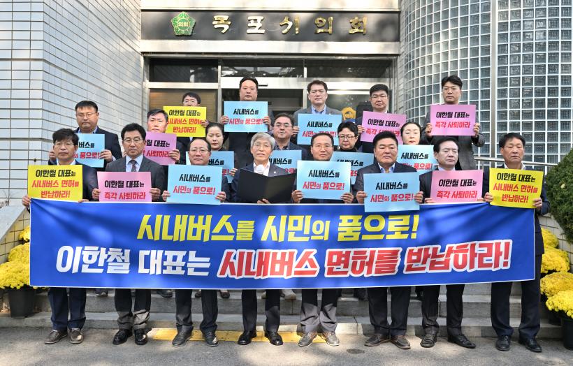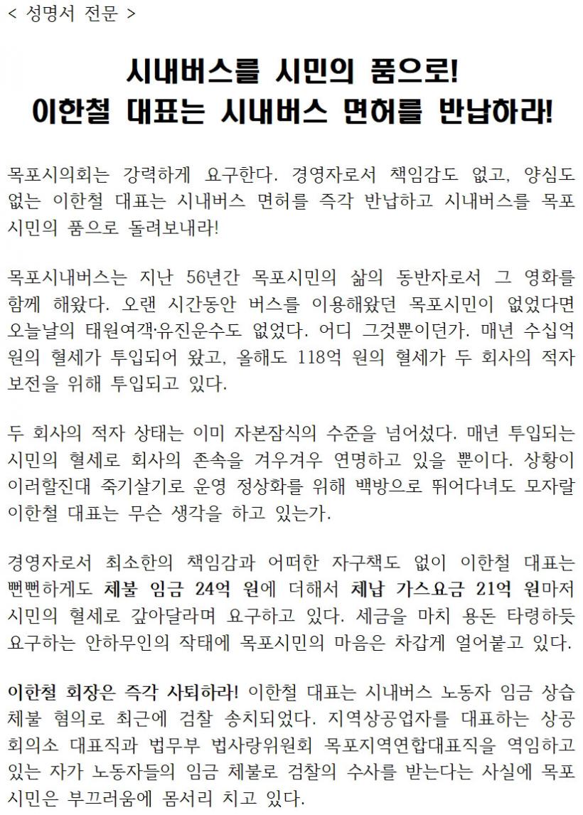 À̳¯ ¸ñÆ÷½ÃÀÇȸ ÀÇ¿ø Àϵ¿Àº ¡°½Ã³»¹ö½º¸¦ ½Ã¹ÎÀÇ Ç°À¸·Î! ÀÌÇÑö ´ëÇ¥´Â ½Ã³»¹ö½º ¸éÇ㸦 ¹Ý³³Ç϶ó! ÀÌÇÑö ´ëÇ¥´Â »çÅðÇ϶ó!¡±¶ó°í ¿ÜÄ¡¸ç ÀÇȸÀÇ ÀÔÀåÀ» Ç¥¸íÇß´Ù.