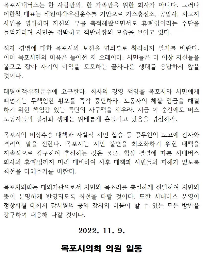 [°ø°£´º½º = ±è¿ëÁø±âÀÚ] ¸ñÆ÷½ÃÀÇȸ(ÀÇÀå ¹®Â÷º¹)°¡ 9ÀÏ Å¿ø¿©°´·À¯Áø¿î¼ö ÀÌÇÑö ´ëÇ¥ÀÇ »çÅð¿Í ½Ã³»¹ö½º ¸éÇ㠹ݳ³À» Ã˱¸ÇÏ´Â ¼º¸í¼¸¦ ¹ßÇ¥Çß´Ù.