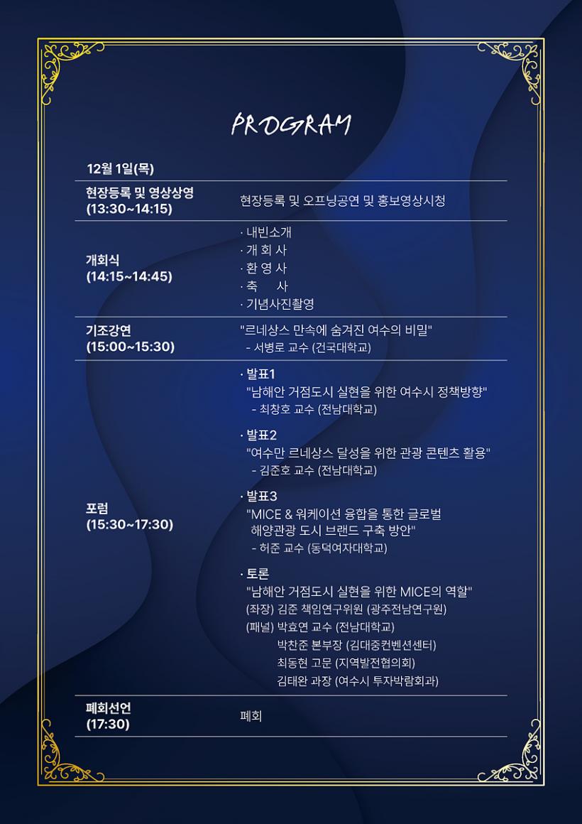 [°ø°£´º½º = ±è¿ëÁø±âÀÚ] ¿©¼ö½Ã(½ÃÀå Á¤±â¸í)°¡ ¿À´Â 12¿ù 1ÀÏ ¿¢½ºÆ÷ÄÁº¥¼Ç¼¾ÅÍ¿¡¼ ¡®³²ÇØ¾È °ÅÁ¡µµ½Ã ½ÇÇöÀ» À§ÇÑ MICEÀÇ ¿ªÇÒ¡¯À̶ó´Â ÁÖÁ¦·Î ¡®2022 Áö¿ª MICE ¿©¼öÆ÷·³¡¯À» °³ÃÖÇÑ´Ù.