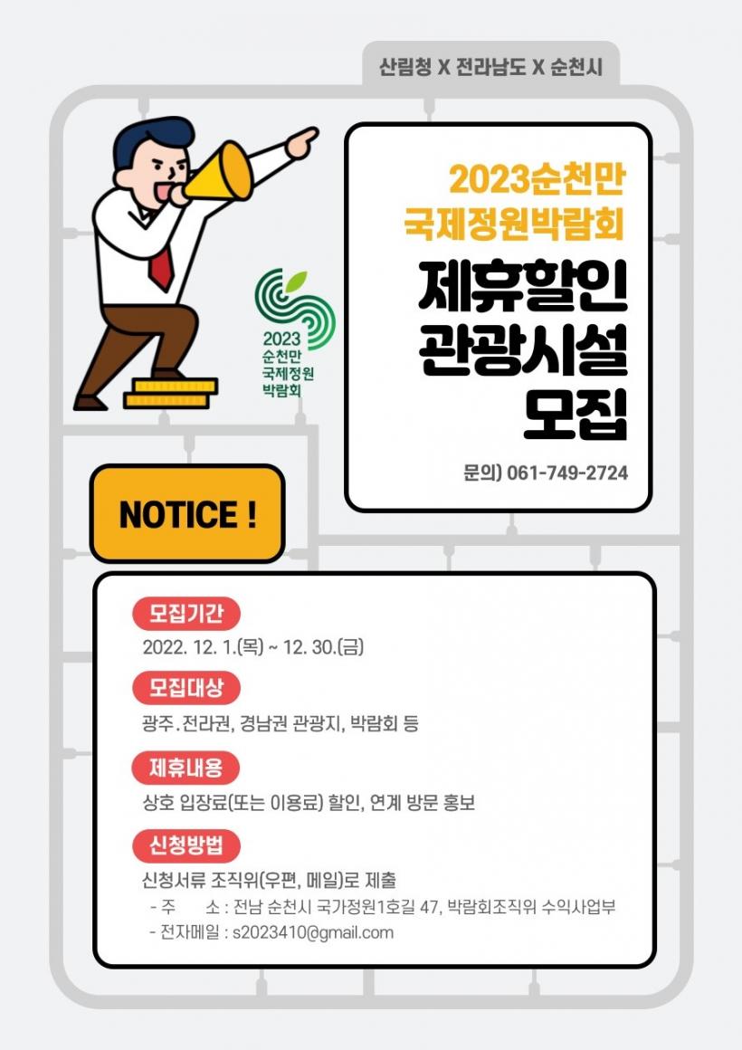 [°ø°£´º½º = ¾ÈÀ翵±âÀÚ] (Àç)¼øÃµ¸¸±¹Á¦Á¤¿ø¹Ú¶÷ȸÁ¶Á÷À§¿øÈ¸(ÀÌ»çÀå ³ë°ü±Ô)°¡ ¿À´Â 30ÀϱîÁö 2023¼øÃµ¸¸±¹Á¦Á¤¿ø¹Ú¶÷ȸ ÀÔÀå±Ç Á¦ÈÞ ÇÒÀÎó¸¦ ¸ðÁýÇÑ´Ù.