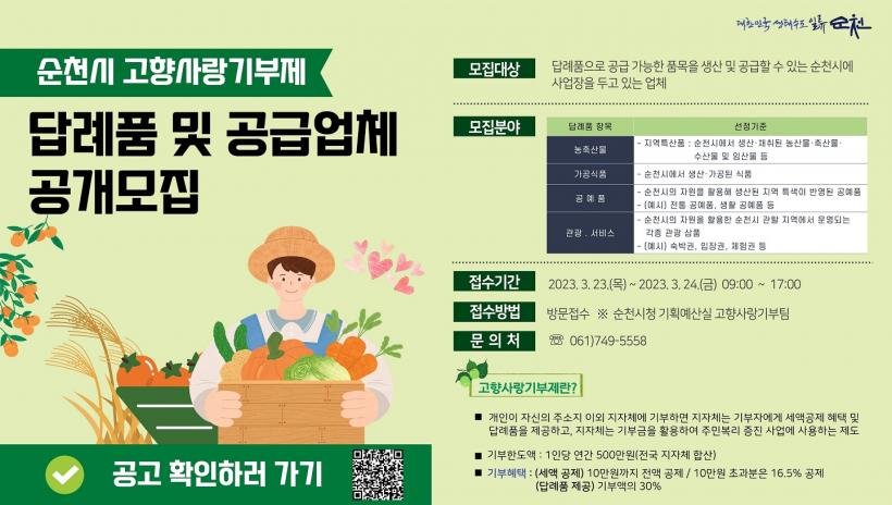 ½Ã´Â Áö³ 1¿ùºÎÅÍ Áö¿ª¿¡¼ »ý»êµÈ ³óÃà»ê¹°, °¡°ø½Äǰ, °ø¿¹Ç°°ú 2023¼øÃµ¸¸±¹Á¦Á¤¿ø¹Ú¶÷ȸ ÀÔÀå±Ç, ¼øÃµ»ç¶û»óǰ±Ç µî 48Á¾ÀÇ ´ä·ÊǰÀ» ¼±Á¤ÇÏ¿© Á¦°øÇϰí ÀÖÀ¸¸ç, À̹ø Ãß°¡ °ø¸ð¸¦ ÅëÇØ ¼øÃµ¸¸ÀÇ Æ¯»öÀ» Áö´Ñ ´Ù¾çÇÑ ´ä·ÊǰÀ» ¼±Á¤ÇÏ°í ±âºÎ À¯ÀÎ È¿°ú·Î Áö¿ª°æÁ¦ Ȱ¼ºÈ¸¦ °ßÀÎÇÒ ¿¹Á¤ÀÌ´Ù.