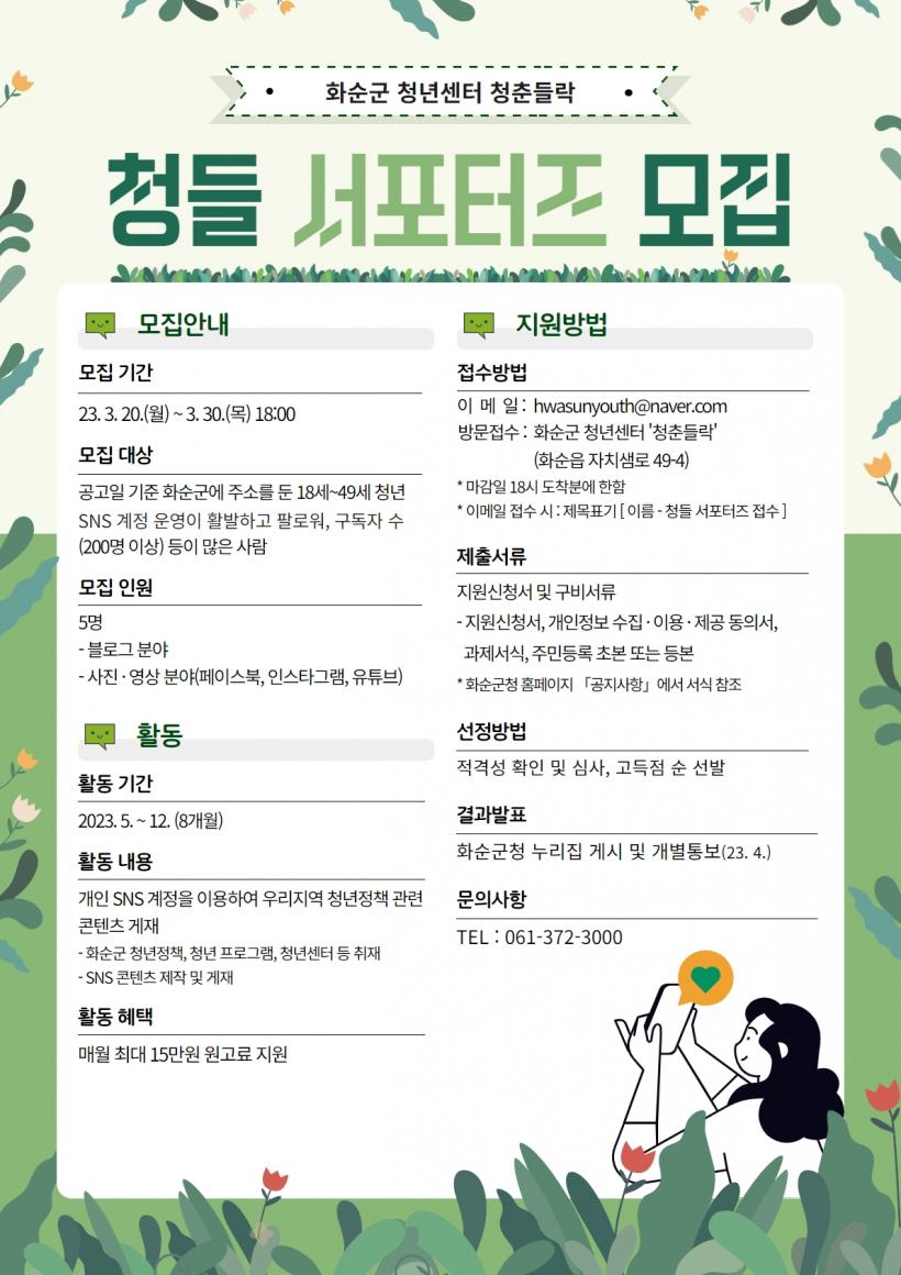 ûµé ¼Æ÷ÅÍÁî Ȱµ¿À» Èñ¸ÁÇÏ´Â »ç¶÷Àº ȼø±º ȨÆäÀÌÁö °øÁö»çÇ×ÀÇ ½Åû¼ µî ¼½ÄÀ» ÀÛ¼ºÇØ È¼ø±º û³â¼¾ÅÍ 1Ãþ »ç¹«½Ç·Î ¹æ¹®Çϰųª À̸ÞÀÏ(hwasunyouth@naver