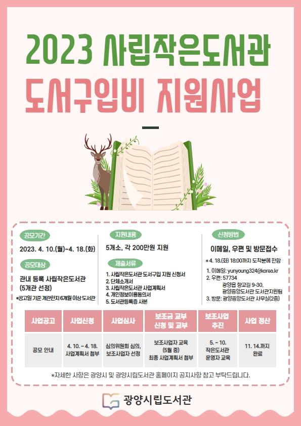 [°ø°£´º½º = ¾ÈÀ翵±âÀÚ] ±¤¾ç½Ã°¡ ¿À´Â 18ÀϱîÁö ¡®2023³â »ç¸³ÀÛÀºµµ¼°ü µµ¼±¸ÀÔºñ Áö¿ø»ç¾÷¡¯¿¡ Âü¿©ÇÒ Áö¿ª ³» »ç¸³ÀÛÀºµµ¼°üÀ» ¸ðÁýÇÑ´Ù°í ¹àÇû´Ù.