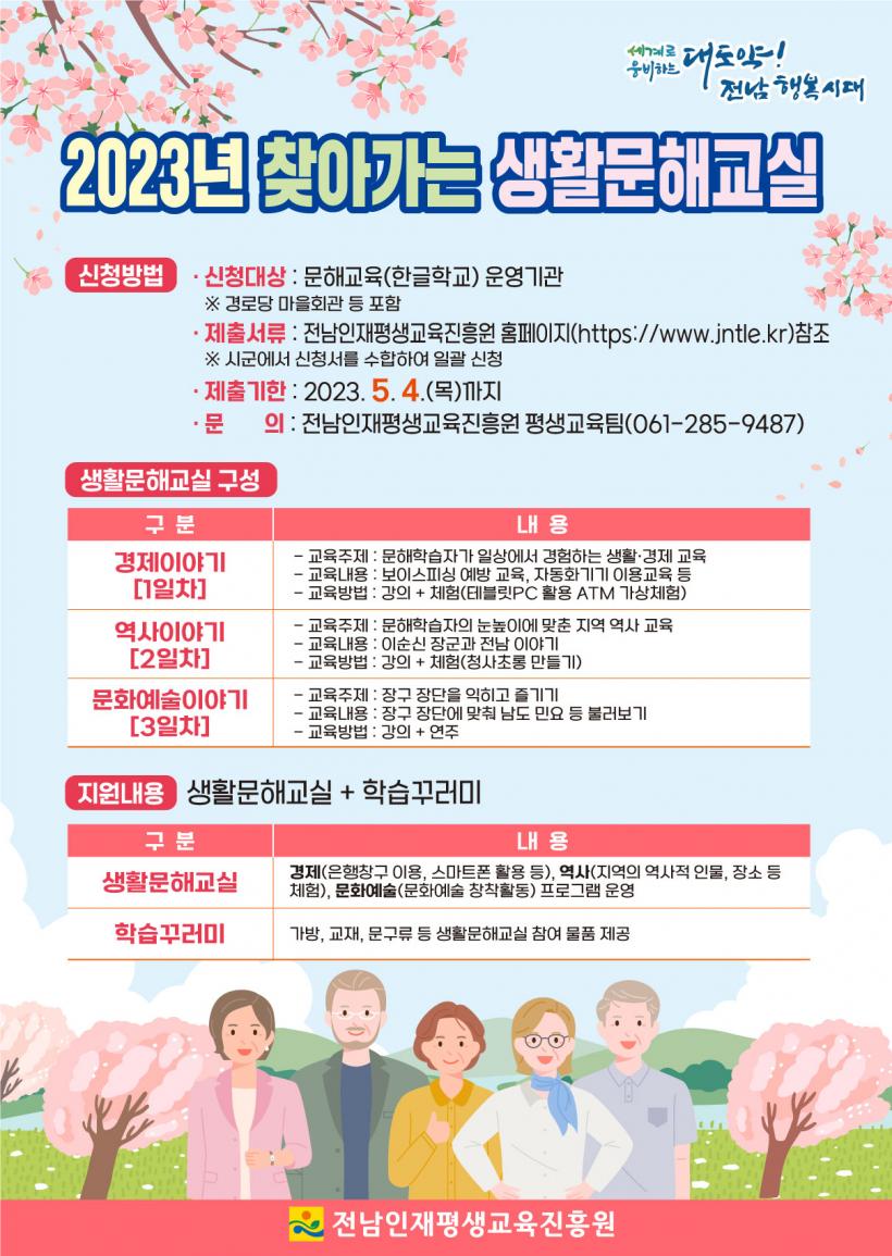 [°ø°£´º½º = ±è¼ö±Ù±âÀÚ] Àü¶ó³²µµ´Â »çȸ¡¤°æÁ¦Àû ¿©°ÇÀ¸·Î ±³À° ±âȸ¸¦ ³õÄ£ ¼ºÀÎÀ» ´ë»óÀ¸·Î ±âÃÊ»ýȰ ´É·ÂÀ» ³ôÀÌ°í »çȸ Âü¿© ±âȸ¸¦ Á¦°øÇϱâ À§ÇÑ ¡®2023³â ã¾Æ°¡´Â »ýȰ¹®Çر³½Ç¡¯ ¿î¿µ±â°üÀ» ¸ðÁýÇÑ´Ù°í ¹àÇû´Ù.