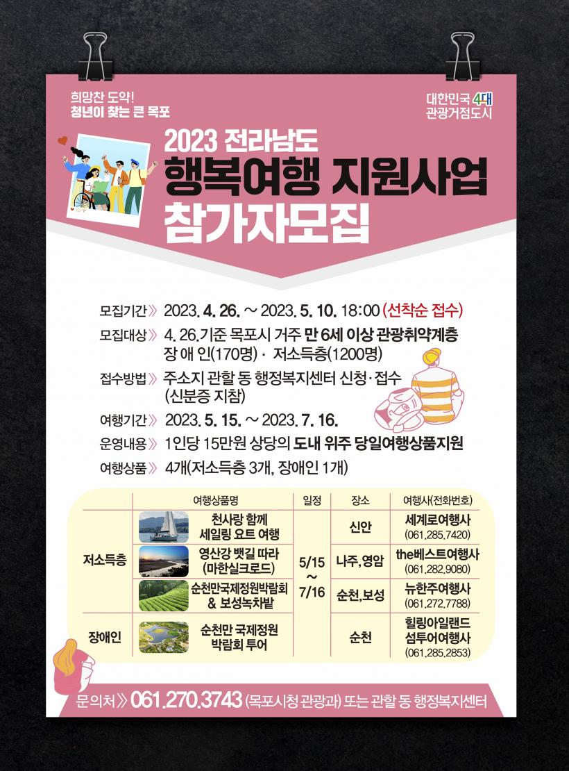 [°ø°£´º½º = ±è¿ëÁø±âÀÚ] ¸ñÆ÷½Ã°¡ 2023³â Àü¶ó³²µµ Çູ¿©Çà Áö¿ø»ç¾÷À» ÃßÁøÇÑ´Ù. ÀÌ´Â ¿©Çà ±âȸ°¡ ÀûÀº Àå¾ÖÀΰú Àú¼ÒµæÃþ µî °ü±¤ Ãë¾à°èÃþ¿¡°Ô °ü±¤±âº»±ÇÀ» º¸ÀåÇϱâ À§ÇÔÀÌ´Ù.