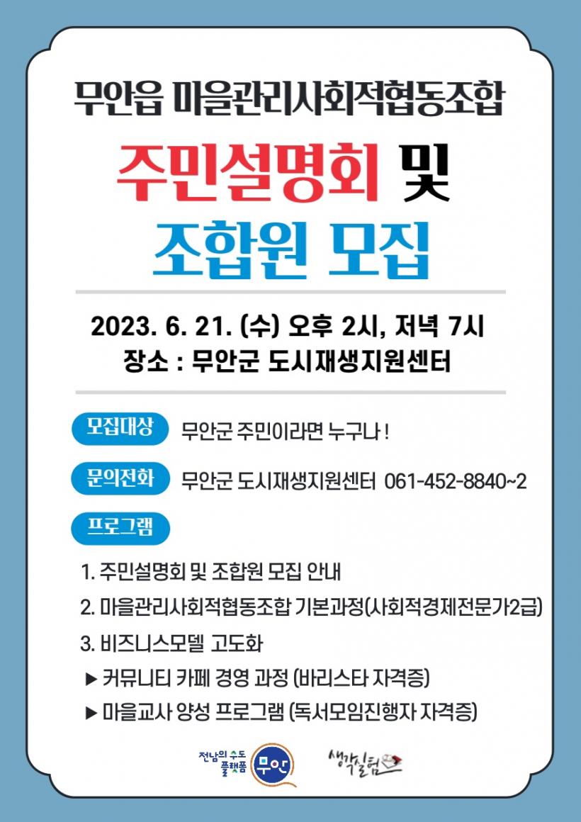 [°ø°£´º½º = ±è¿ëÁø±âÀÚ] Àü³² ¹«¾È±º(±º¼ö ±è»ê)Àº ¿À´Â 6¿ù 21ÀÏ(¼ö) ¿ÀÈÄ 2½Ã, Àú³á 7½Ã¿¡ ¹«¾È±º µµ½ÃÀç»ýÁö¿ø¼¾ÅÍ¿¡¼ µµ½ÃÀç»ý ¸¶À»°ü¸®Çùµ¿Á¶ÇÕ ½Ç¹«¿ª·® °È¸¦ À§ÇÑ Áֹμ³¸íȸ¸¦ °³ÃÖÇÒ ¿¹Á¤ÀÌ´Ù.