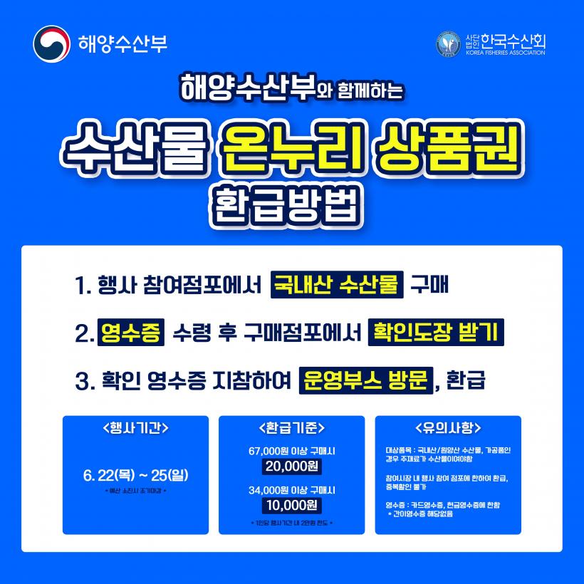 Çà»ç´Â ¿À´Â 22ÀϺÎÅÍ 25ÀϱîÁö ÁøÇàµÇ¸ç, ¼ö»ê¹° ÆÇ¸ÅÁ¡Æ÷¿¡¼ ±¹³»»ê ¼ö»ê¹°À» ±¸ÀÔÇÏ¸é ½ÃÀå ³» ȯ±Þ ºÎ½º¿¡¼ ¿µ¼öÁõÀ» È®ÀÎÇÏ°í ´çÀÏ ±¸¸Å±Ý¾×ÀÇ ÃÖ´ë 30%¸¦(ÃÖ´ë 2¸¸¿ø) ¿Â´©¸®»óǰ±ÇÀ¸·Î ȯ±ÞÇØÁÖ´Â ¹æ½ÄÀ¸·Î ÁøÇàµÈ´Ù.