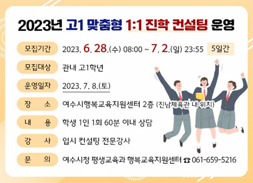 [°ø°£´º½º = ±è¿ëÁø±âÀÚ] ¿©¼ö½Ã(½ÃÀå Á¤±â¸í)°¡ ¿À´Â 7¿ù 8ÀÏ Åä¿äÀÏ Çູ±³À°Áö¿ø¼¾ÅÍ¿¡¼ ¡®°í1 ¸ÂÃãÇü 1´ë1 ÁøÇÐ ÄÁ¼³ÆÃ¡¯À» ¿î¿µÇÑ´Ù.