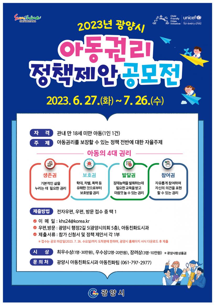[°ø°£´º½º = ¾ÈÀ翵±âÀÚ] ±¤¾ç½Ã´Â ¾Æµ¿ÀÇ ±Ç¸®°¡ Á¸ÁߵǴ ¾Æµ¿Ä£Èµµ½Ã Á¶¼ºÀ» À§ÇØ ¡®2023³â ±¤¾ç½Ã ¾Æµ¿±Ç¸® Á¤Ã¥Á¦¾È °ø¸ðÀü¡¯À» 6¿ù 27ÀϺÎÅÍ 7¿ù 26ÀϱîÁö ÁøÇàÇÑ´Ù°í ¹àÇû´Ù.