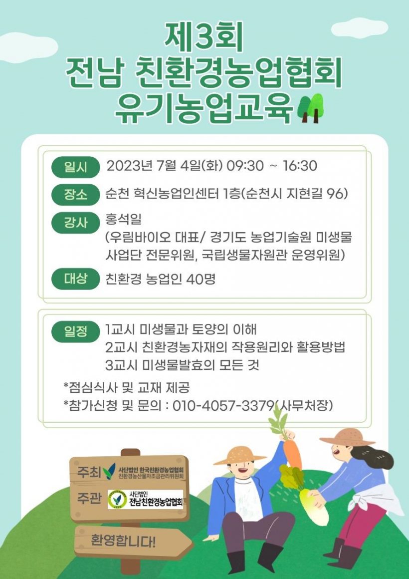 [°ø°£´º½º = ±è¼ö±Ù±âÀÚ] Àü¶ó³²µµ´Â (»ç)Àü³²Ä£È¯°æ³ó¾÷Çùȸ(ȸÀå À¯Àå¼ö)°¡ À¯±â³ó¾÷¿¡ ´ëÇÑ Á¤È®ÇÑ ÀÌÇØ·Î ģȯ°æ³ó¾÷ È®»êÀ» À§ÇÑ À¯±â³ó¾÷ ±³À°À» ¿À´Â 4Àϰú 18ÀÏ ¼øÃµ°ú ¿µ¾Ï¿¡¼ °³ÃÖÇÑ´Ù°í ¹àÇû´Ù.