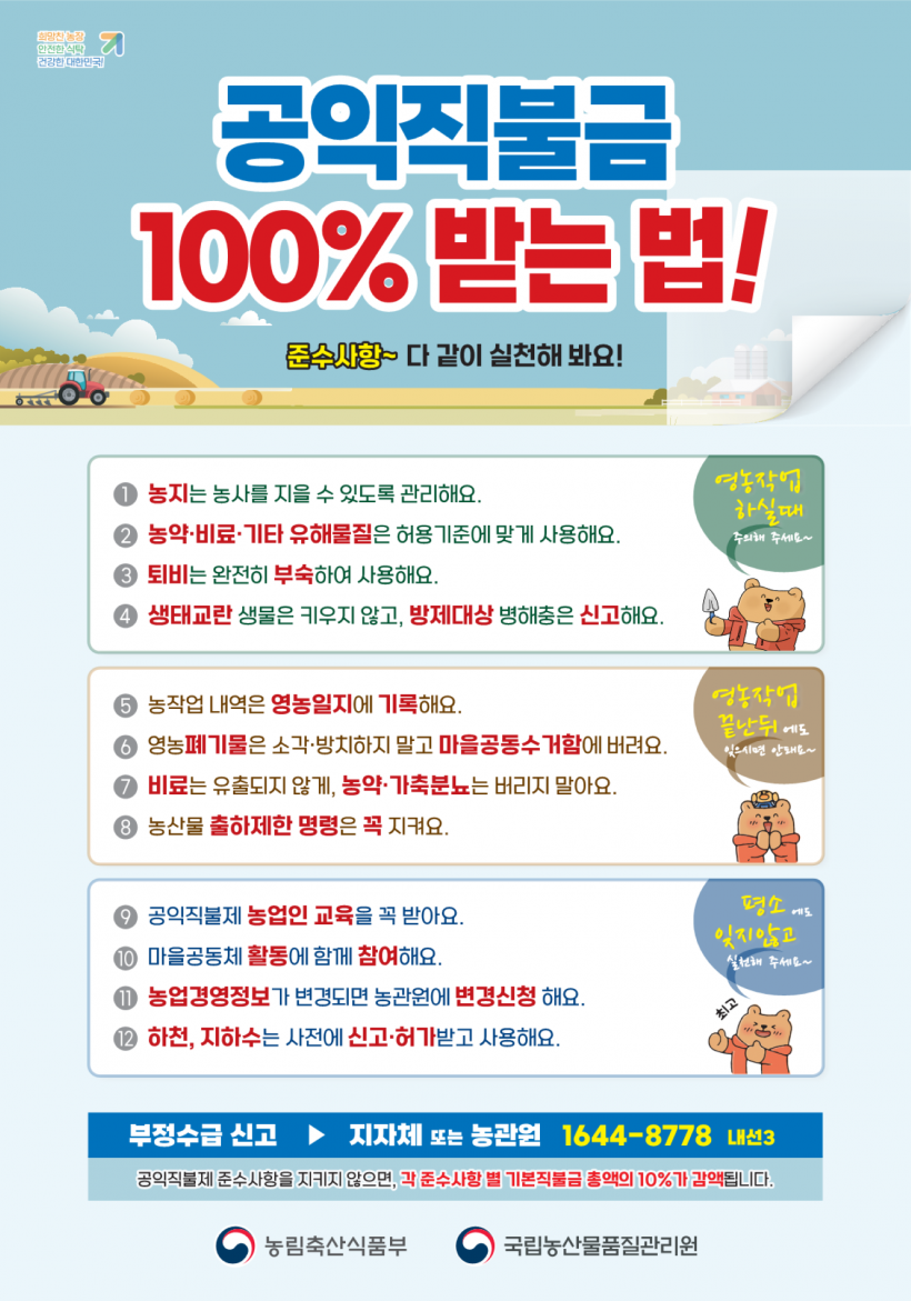 ÀÚ°Ý¿ä°Ç °ËÁõ°ú ÇöÀåÁ¡°Ë °á°ú Áö±Þ ´ë»ó ³óÁö¡¤³ó¾÷ÀÎ ¿ä°ÇÀ» ÃæÁ·ÇÏÁö ¸øÇϸé Áö±Þ ´ë»ó¿¡¼ Á¦¿ÜÇÑ´Ù. À̹ۿ¡ Áؼö»çÇ×À» ÀÌÇàÇÏÁö ¾ÊÀ¸¸é °øÀÍÁ÷ºÒ±Ý ÃѾ×ÀÇ 5% ¶Ç´Â 10%¸¦ °¨¾×ÇÑ´Ù. °°Àº Áؼö»çÇ×À» Áö³ÇØ¿¡ ÀÌ¾î ¿ÃÇØµµ ¹Ýº¹ÀûÀ¸·Î À§¹ÝÇÑ °æ¿ì ¿ÃÇØ °¨¾×·üÀ» 2¹è Àû¿ëÇÑ´Ù.