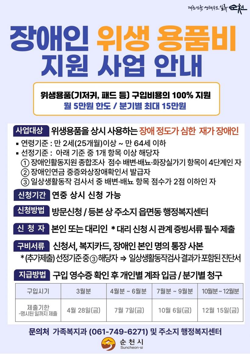 [°ø°£´º½º = ¾ÈÀ翵±âÀÚ] ¼øÃµ½Ã(½ÃÀå ³ë°ü±Ô)°¡ Àå¾ÖÁ¤µµ°¡ ½ÉÇÑ Àç°¡ Àå¾ÖÀο¡°Ô Áö¿øÇÏ´Â À§»ý¿ëǰ ±¸ÀÔºñÀÇ ±Ô¸ð¸¦ ±âÁ¸ 50%¿¡¼ 100%·Î È®´ëÇß´Ù°í 17ÀÏ ¹àÇû´Ù.