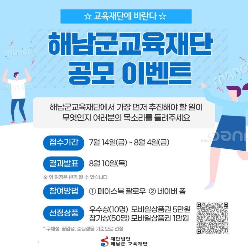 ¿ì¼ö»ó 10¸í¿¡°Ô´Â 5¸¸¿ø »ó´ç ¸ð¹ÙÀÏ»óǰ±Ç, Âü°¡»ó 50¸í¿¡°Ô´Â 1¸¸¿ø »ó´ç ¸ð¹ÙÀÏ »óǰ±ÇÀÌ Á¦°øÇÑ´Ù. Âü¿©¹æ¹ýÀº ÇØ³²±º±³À°Àç´Ü ÆäÀ̽ººÏ¿¡ Ä£±¸¸Î±â¸¦ ÇÑ ÈÄ °Ô½ÃµÈ ³×À̹öÆû¿¡ »çÁø°ú ÀǰßÀ» Á¦ÃâÇÏ¸é µÈ´Ù.
