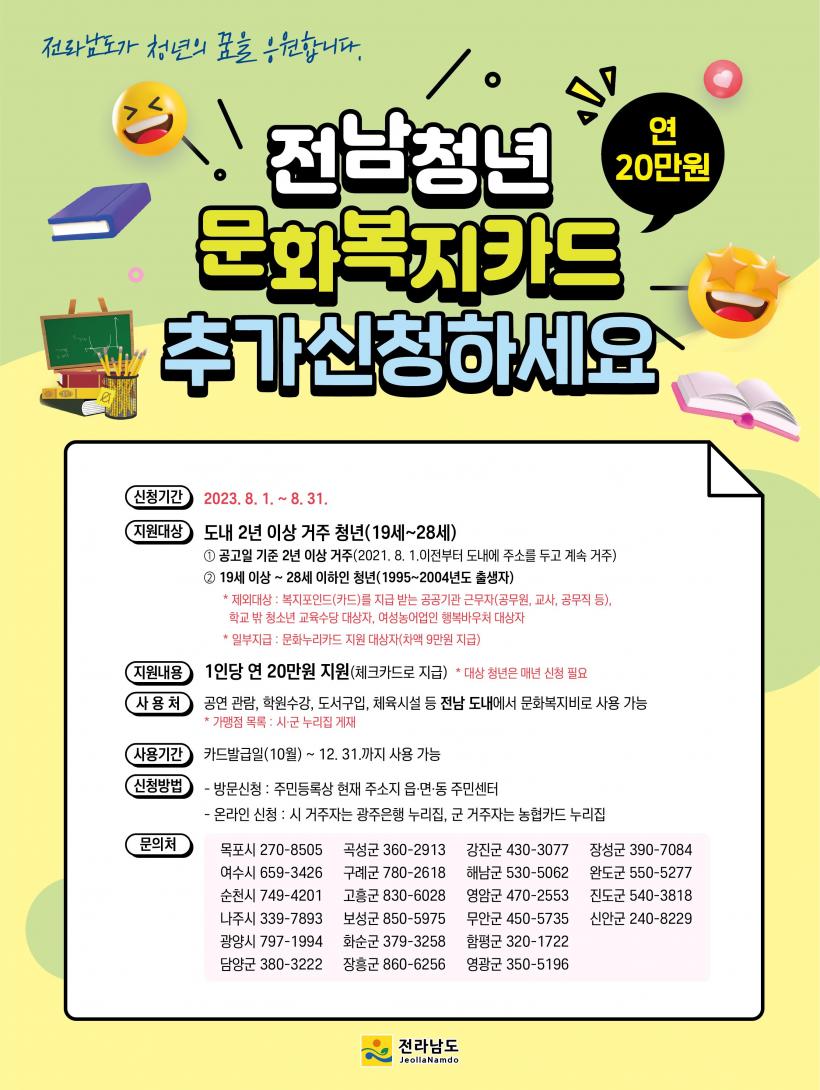 [°ø°£´º½º = ±è¼ö±Ù±âÀÚ] Àü¶ó³²µµ´Â ¿¬ 20¸¸ ¿øÀÇ ¹®Èº¹Áöºñ¸¦ Áö¿øÇÏ´Â ¡®Ã»³â ¹®Èº¹ÁöÄ«µå¡¯»ç¾÷ Ãß°¡ ½ÅûÀ» 8¿ù ÇÑ ´Þ°£ ¹Þ´Â´Ù°í ¹àÇû´Ù.