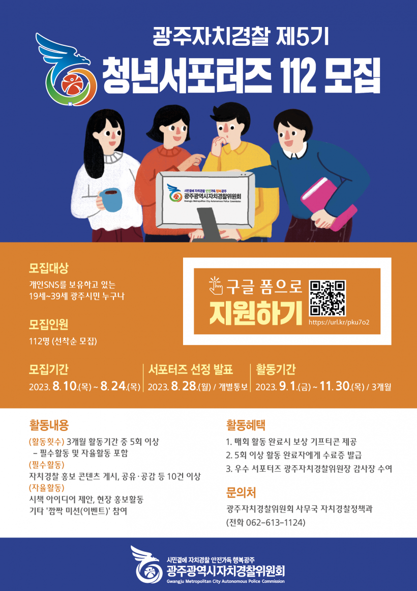 [°ø°£´º½º = ±è¼ö±Ù±âÀÚ] ±¤ÁÖ±¤¿ª½ÃÀÚÄ¡°æÂûÀ§¿øÈ¸´Â ÀÚÄ¡°æÂû ºÐ¾ß ¿Â¶óÀÎ È«º¸¿Í Áö¿ª ¸ÂÃãÇü Ä¡¾È½ÃÃ¥ ¹ß±¼À» À§ÇÑ ¡®Á¦5±â û³â ¼Æ÷ÅÍÁ 112¸íÀ» ¸ðÁýÇÑ´Ù.