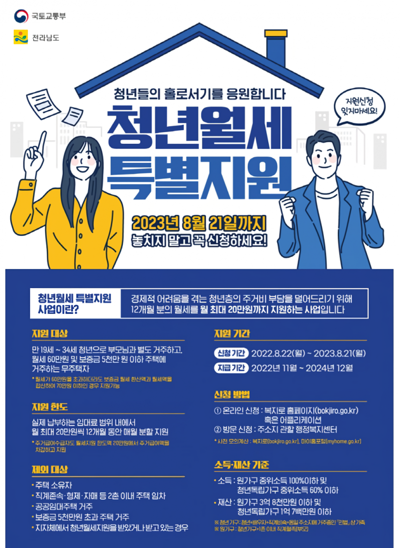 [°ø°£´º½º = ±è¼ö±Ù±âÀÚ] Àü¶ó³²µµ°¡ Àú¼Òµæ û³âÃþÀ» ´ë»óÀ¸·Î Áְźñ ºÎ´ãÀ» ÁÙÀ̱â À§ÇØ ÃßÁøÇϴ û³â¿ù¼¼ Ưº°Áö¿ø »ç¾÷ ½Åû ¸¶°¨ÀÏÀÌ ¿À´Â 21ÀÏ·Î ´Ù°¡¿È¿¡ µû¶ó ±âÇÑ¿¡ ½ÅûÇÒ °ÍÀ» Àû±Ø È«º¸Çϰí ÀÖ´Ù.