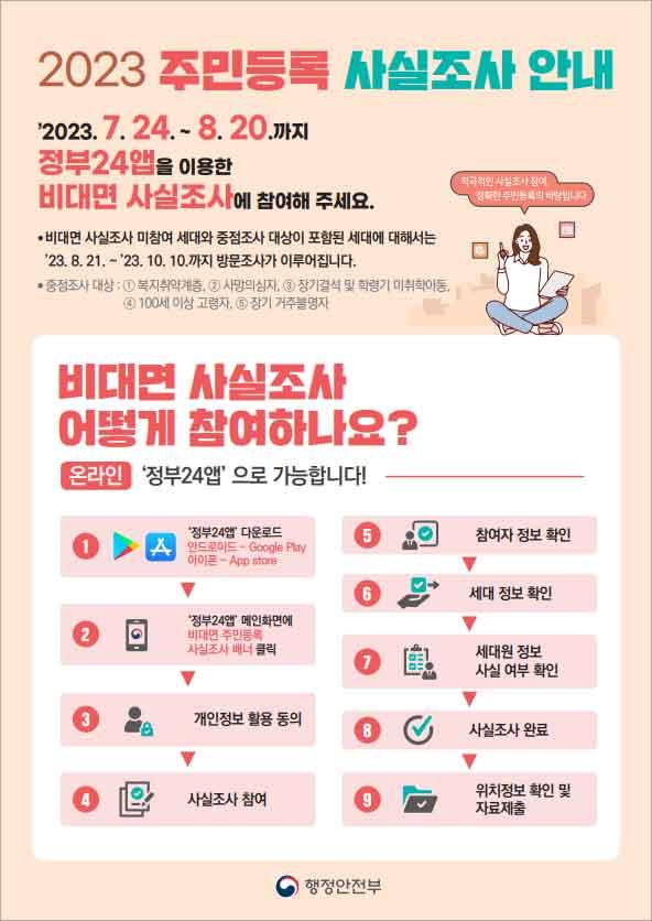 Áֹεî·Ï »ç½ÇÁ¶»ç´Â ¸Å³â 1ȸ ÀÌ»ó Àü ±¹¹ÎÀ» ´ë»óÀ¸·Î Áֹεî·ÏÁö¿Í ½Ç°ÅÁÖÁö ÀÏÄ¡ ¿©ºÎ¸¦ Á¶»çÇÏ´Â °ÍÀ¸·Î, À̹ø »ç½ÇÁ¶»ç´Â Ãâ»ý¹Ìµî·Ï ¾Æµ¿ ½Å°í±â°£µµ ÇÔ²² ¿î¿µÇÑ´Ù.