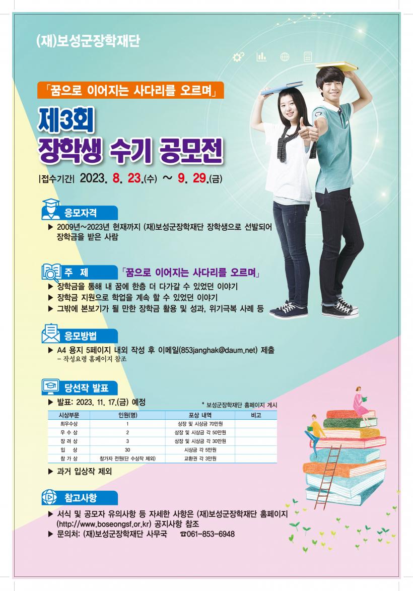 °ø¸ð ÁÖÁ¦´Â ¡®²ÞÀ¸·Î À̾îÁö´Â »ç´Ù¸®¸¦ ¿À¸£¸ç¡¯ÀÌ´Ù. ÀåÇбÝÀ» ÅëÇØ ³» ²Þ¿¡ ÇÑÃþ ´õ ´Ù°¡°¥ ¼ö ÀÖ¾ú´ø À̾߱â, º»ÀÎÀÇ Àç´ÉÀ» ´õ °è¹ßÇÒ ¼ö ÀÖ¾ú´ø ³»¿ë, ÀåÇбÝÀÌ Àλý¿¡ ¹ÌÄ£ ¿µÇâ µîÀ» ´ãÀ¸¸é µÈ´Ù.